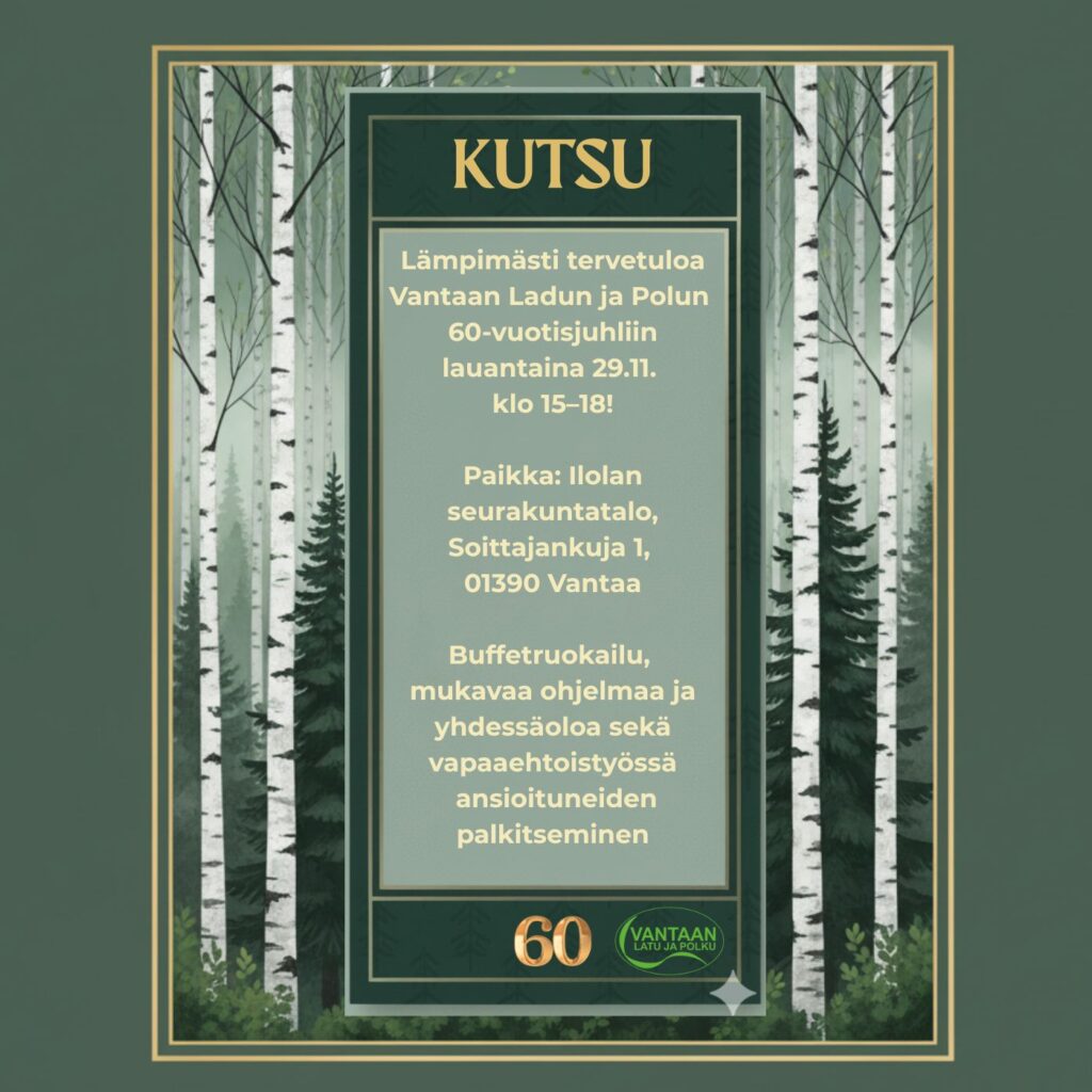 Etsimme Vantaan Ladun ja Polun hallitukselle puheenjohtajaa kaksivuotiskaudeksi 2026–2027 nykyisen puheenjohtajan toimikauden päättyessä tämän vuoden lopussa. Saat johdettavaksesi vireästi toimivan aktiivisen yhdistyksen. Puheenjohtajan valitsee yhdistyksen syyskokous 11. marraskuuta 2025. Kiinnostaisiko tehtävä sinua tai tiedätkö jonkun, joka voisi olla kiinnostunut tällaisesta vapaaehtoistyöstä? Haluatko kuulla lisää? Laita viestiä tai soita. Lisätietoja tehtävistä ja yhdistyksestä saat puheenjohtaja Maarit […][Lue lisää »]