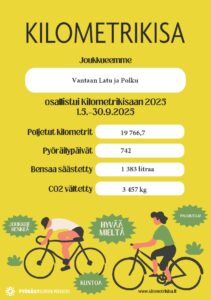 Vantaan Latu ja Polku osallistui kuudennen kerran leikkimieliseen polkupyöräilyn Kilometrikisaan, joka ajettiin 1.5.–30.9.2025. Joukkueessamme oli mukana 18 polkijaa, jotka ajoivat yhteensä yli 19 700 kilometriä. Kilometrikisassa 2025 oli mukana 3 253 joukkuetta, mikä on enemmän kuin koskaan aikaisemmin. Kiitos ja onnittelut jokaiselle mukana olleelle oman kunnon kohottamisesta ja upeasta panoksesta yhteiseen pottiin! Lue lisää Kilometrikisasta[Lue lisää »]